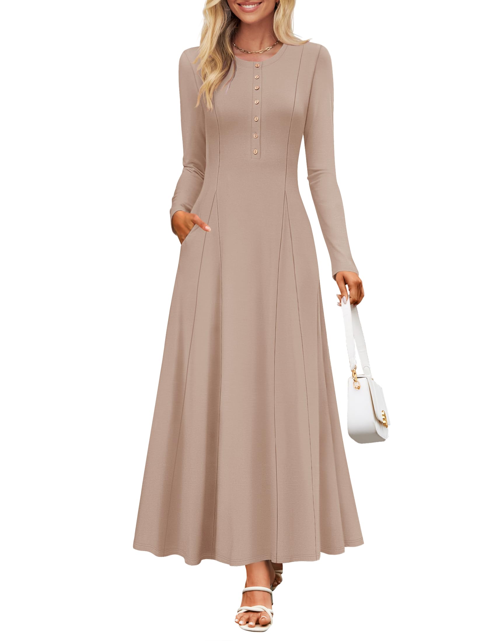 ZESICA Womens Elegant Maxi Dresses 2025 Spring Long Sleeve Button Casual A Line Boho Flowy Dress with PocketsKhakiXL